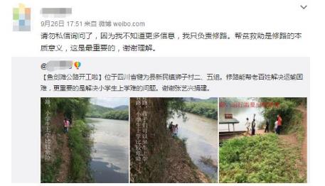 據(jù)悉,9月26日,有網(wǎng)友爆料稱(chēng),張藝興為四川農(nóng)村捐建公路,幫老百姓解決運(yùn)輸困難,更重要的是解決小學(xué)生上學(xué)難的問(wèn)題。該網(wǎng)友發(fā)文稱(chēng)“謝謝張藝興捐建”,隨后又表示“請(qǐng)勿私信詢(xún)問(wèn)了,因?yàn)槲也恢栏嘈畔?,我只?fù)責(zé)修路。幫貧救助是修路的本質(zhì)意義,這是最重要的,謝謝理解”。